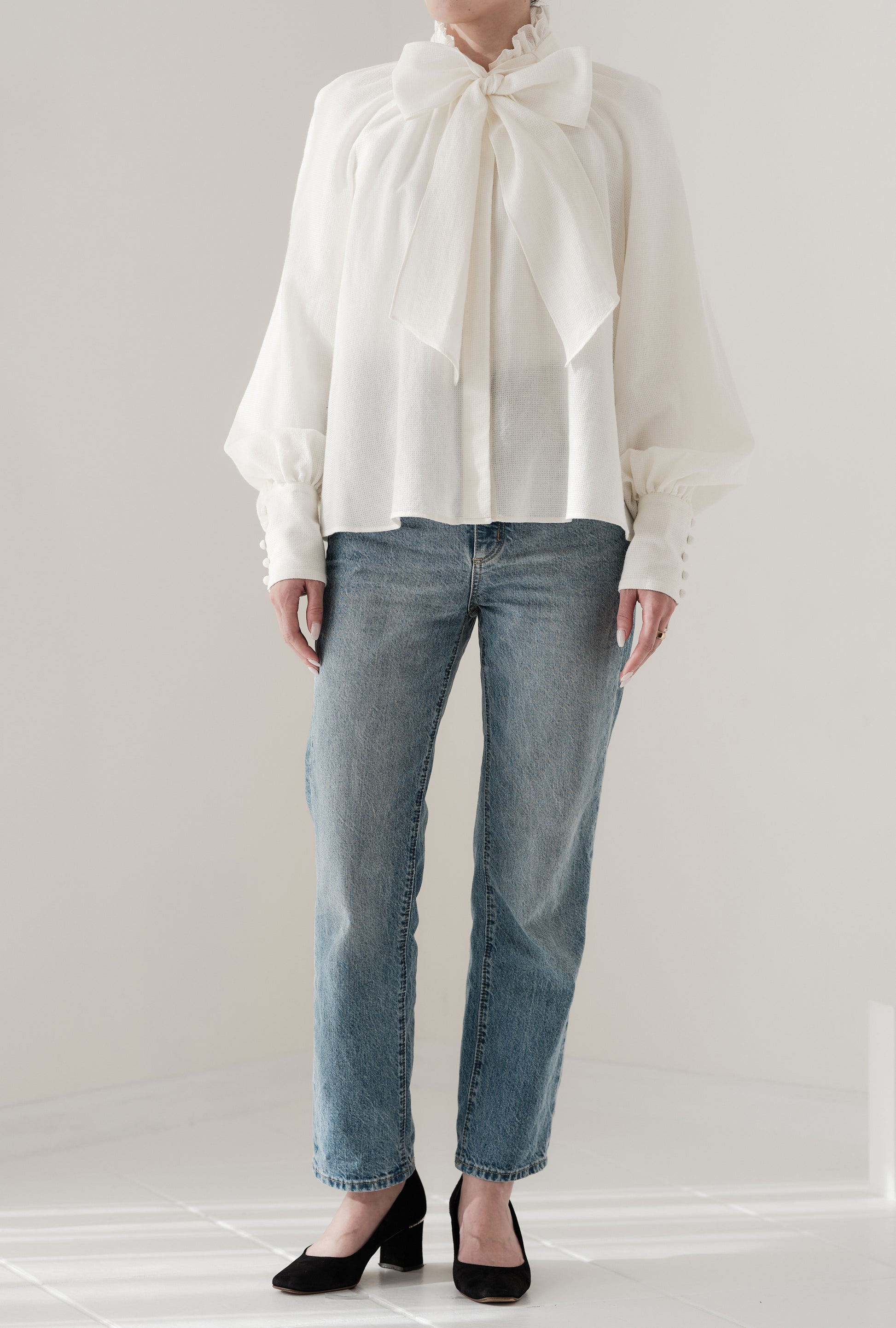 ふんわりとしたフェミニンなシルエットに、襟のフリルやカフスのくるみボタンがアクセント。