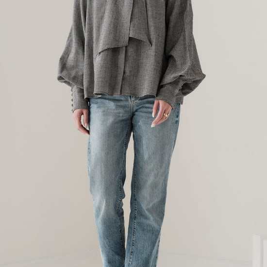 生地は世界三大ウール生産地である尾州地方にて、細番手の梳毛ウールと綿を粗く目を透かして交織にした、上品なシアー感のあるaLORSオリジナルの生地です。ウールと綿を交織にすることで肌なじみが非常に良く、とても軽やかであたたかくしなやかさに富んでいます。