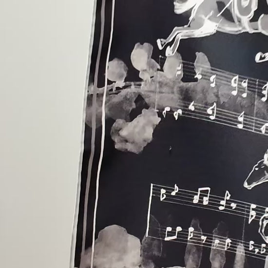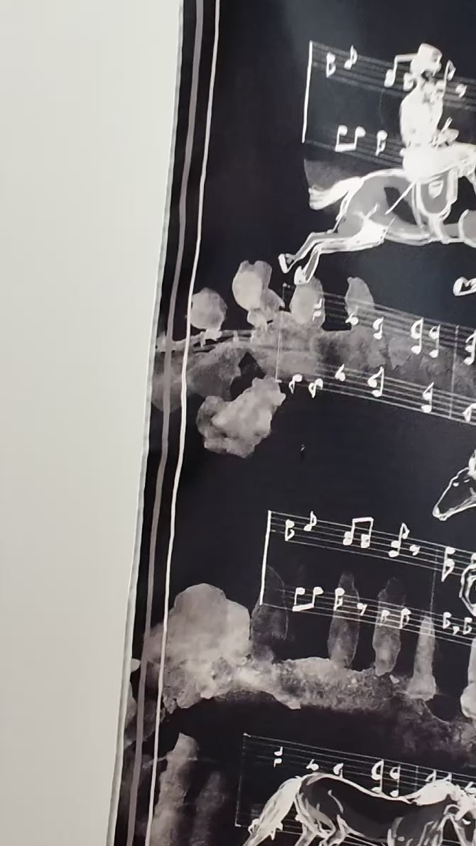 五線譜の上を騎士(Cavaliers)たちが駆け抜けるような、音楽的な躍動感。音符が風や蹄のリズムのようにも見える、ポエティックなデザインを描きました。