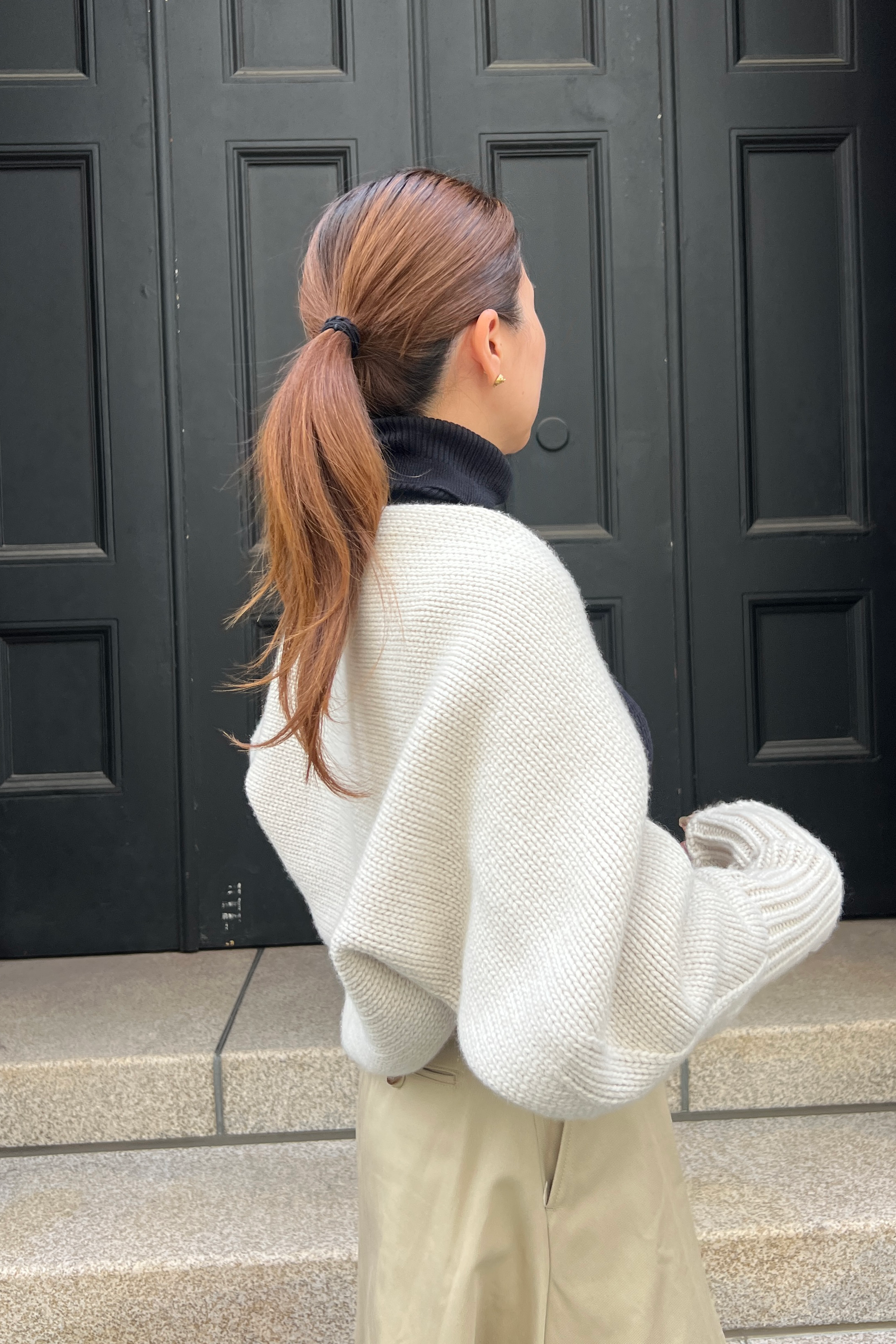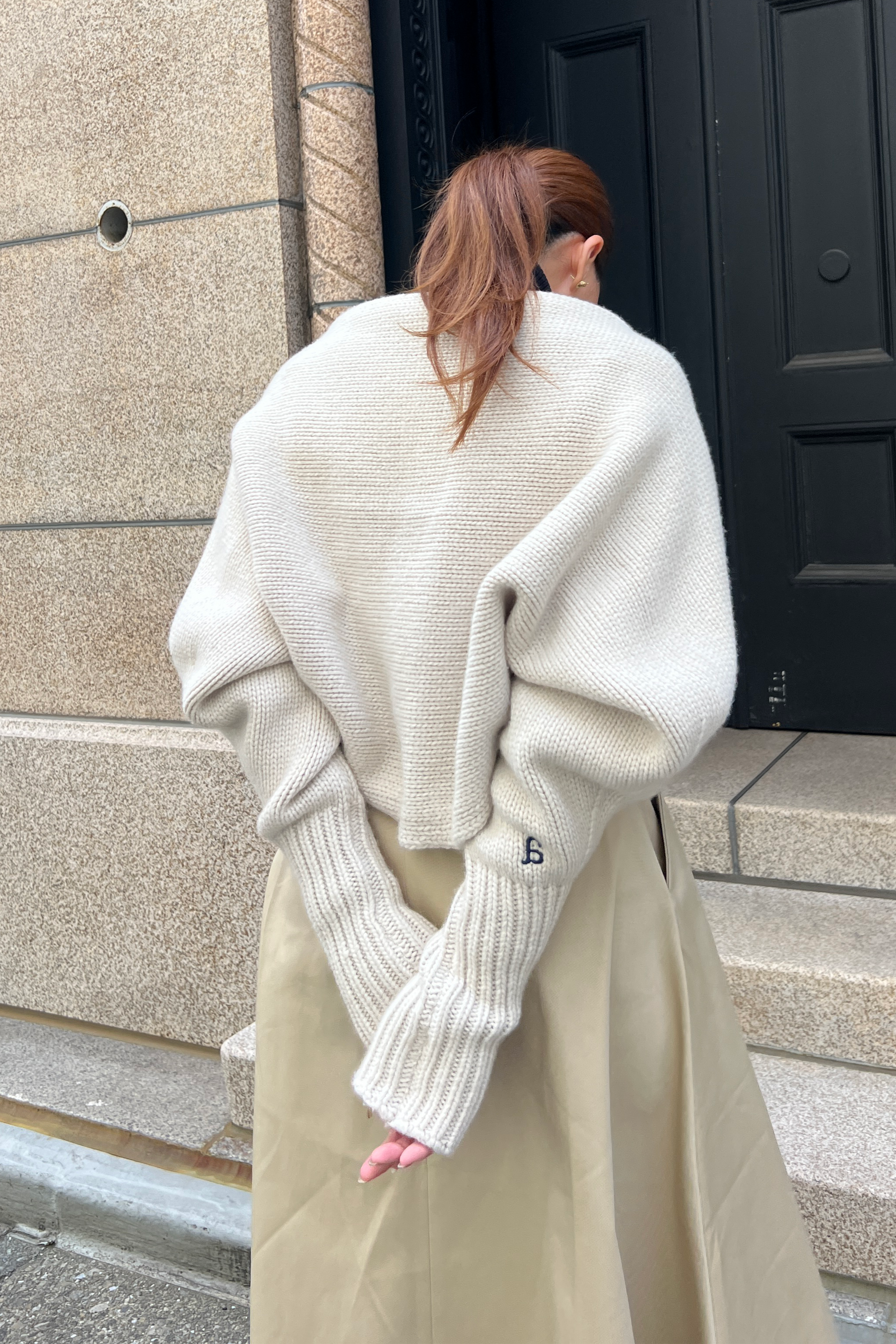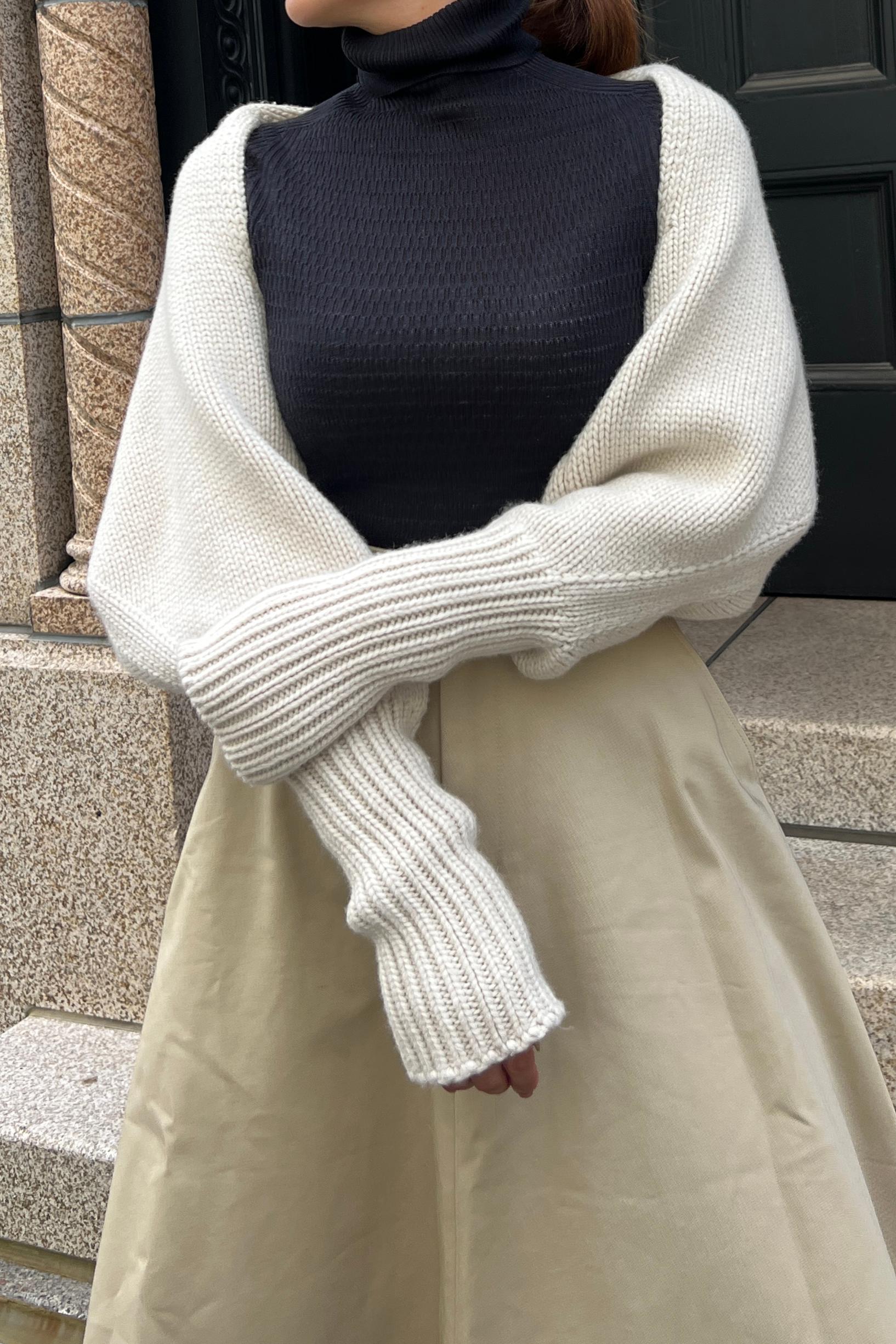 袖口のリブを両端に施し首周りにボリュームが出るよう調整。また、腕を通せばボレロにもなる2way仕様。