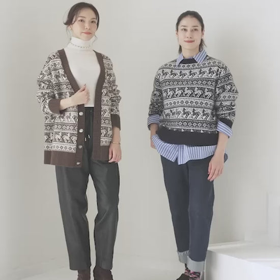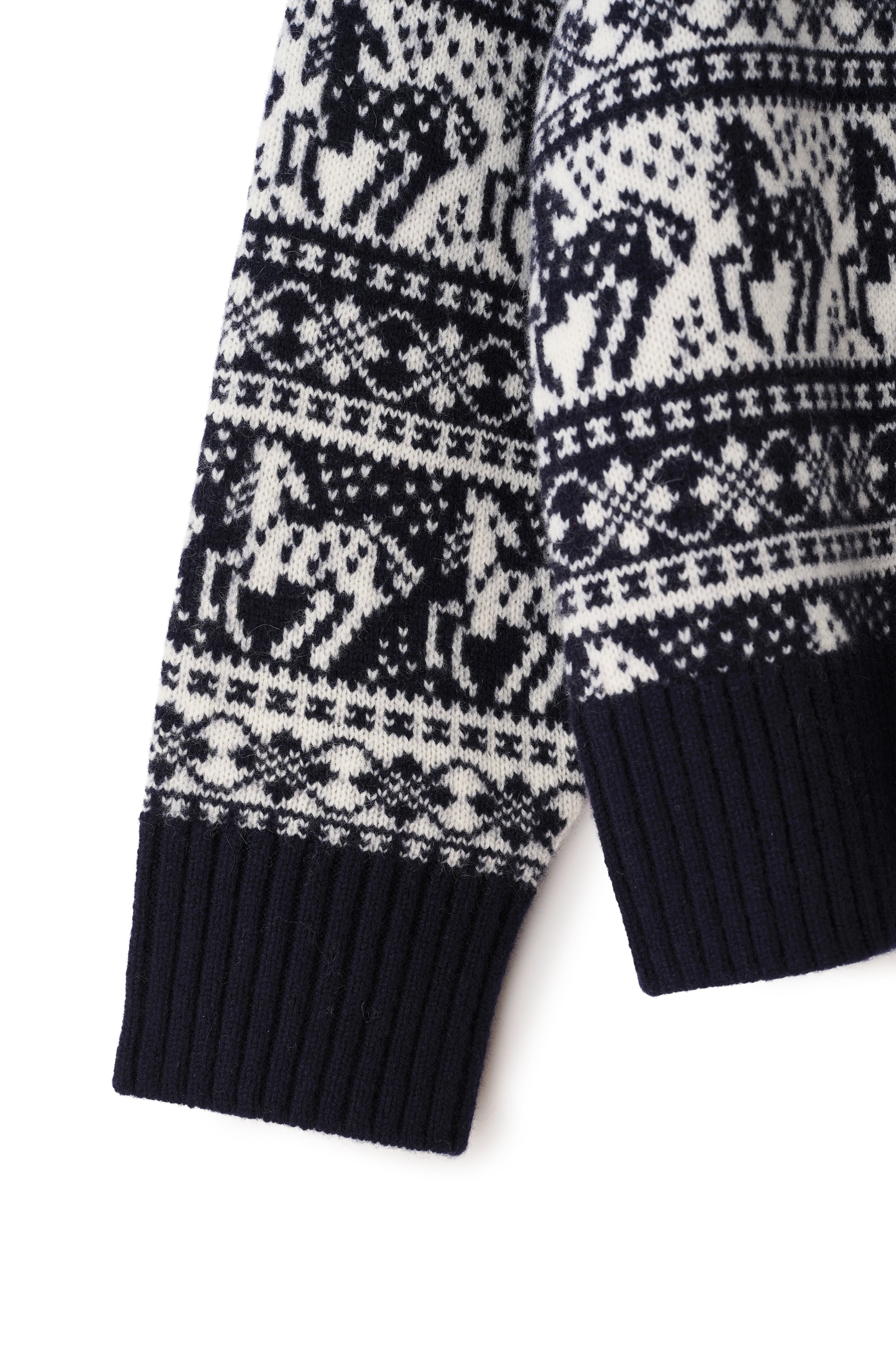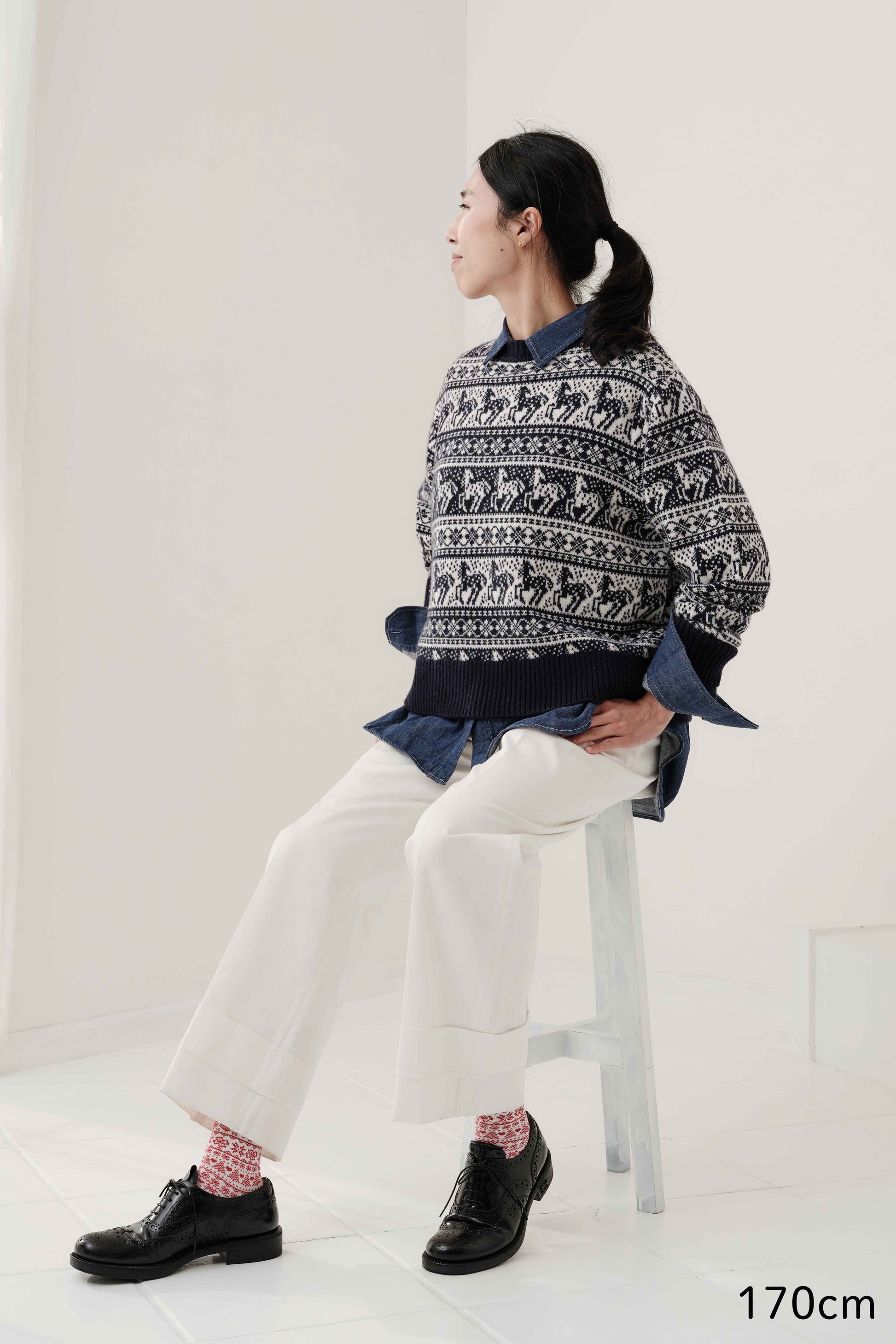 ◼︎デザイン:ノルディック柄に馬モチーフを組み合わせたオリジナルパターン。程よくゆとりのあるシルエットで、クラシカルでありながら印象的な一枚です。
