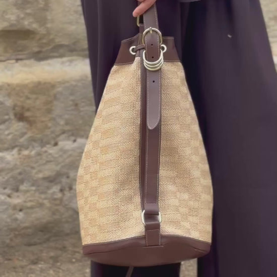 高級素材として知られるラフィアの風合いを、ポリアミド(ナイロン)の特性を活かして忠実に再現した、イタリア産の機能性ファブリックを使用