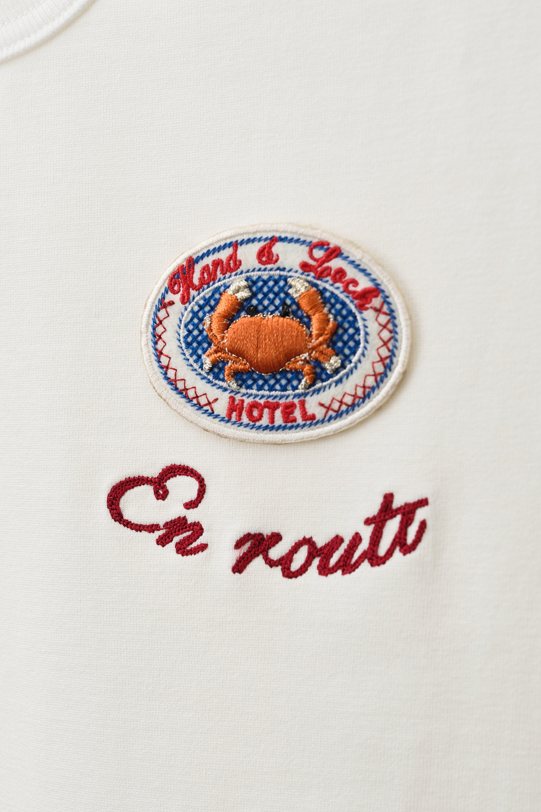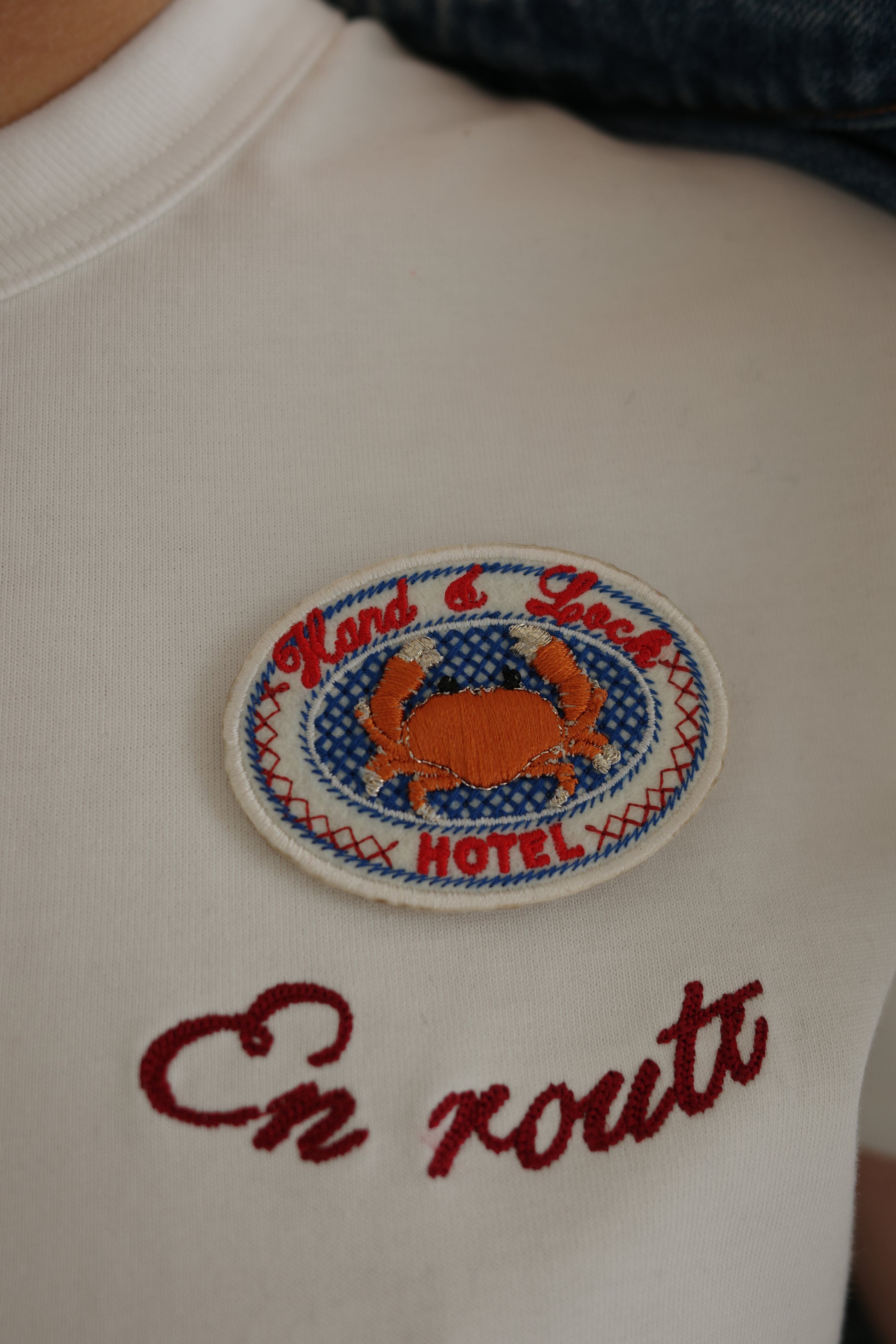 ワッペンには、Hand & Lockによるカニの刺繍モチーフを。英国の海辺の旅を思わせるノスタルジックなカニのワッペンです。