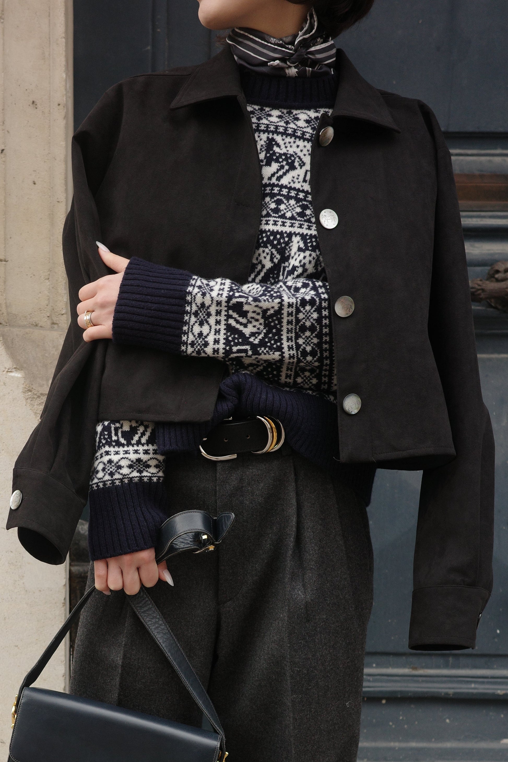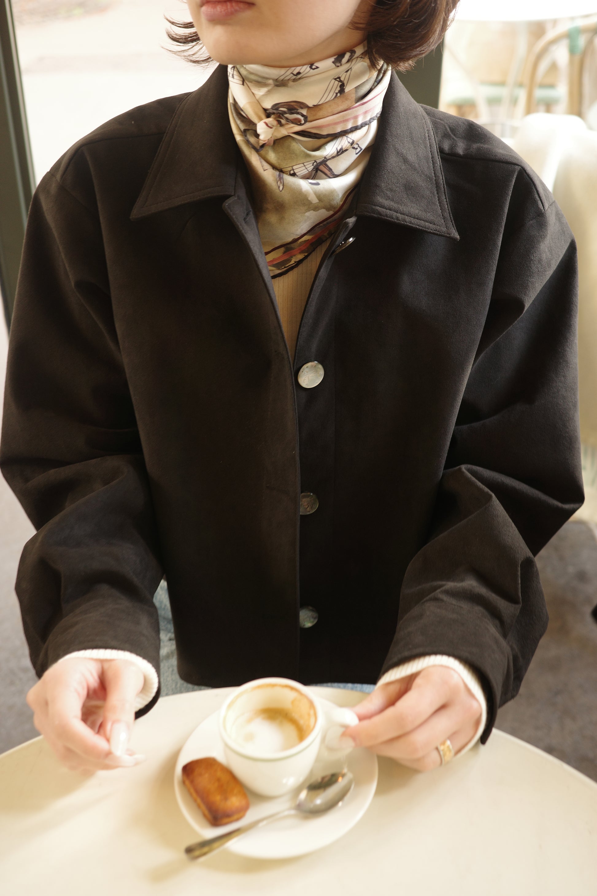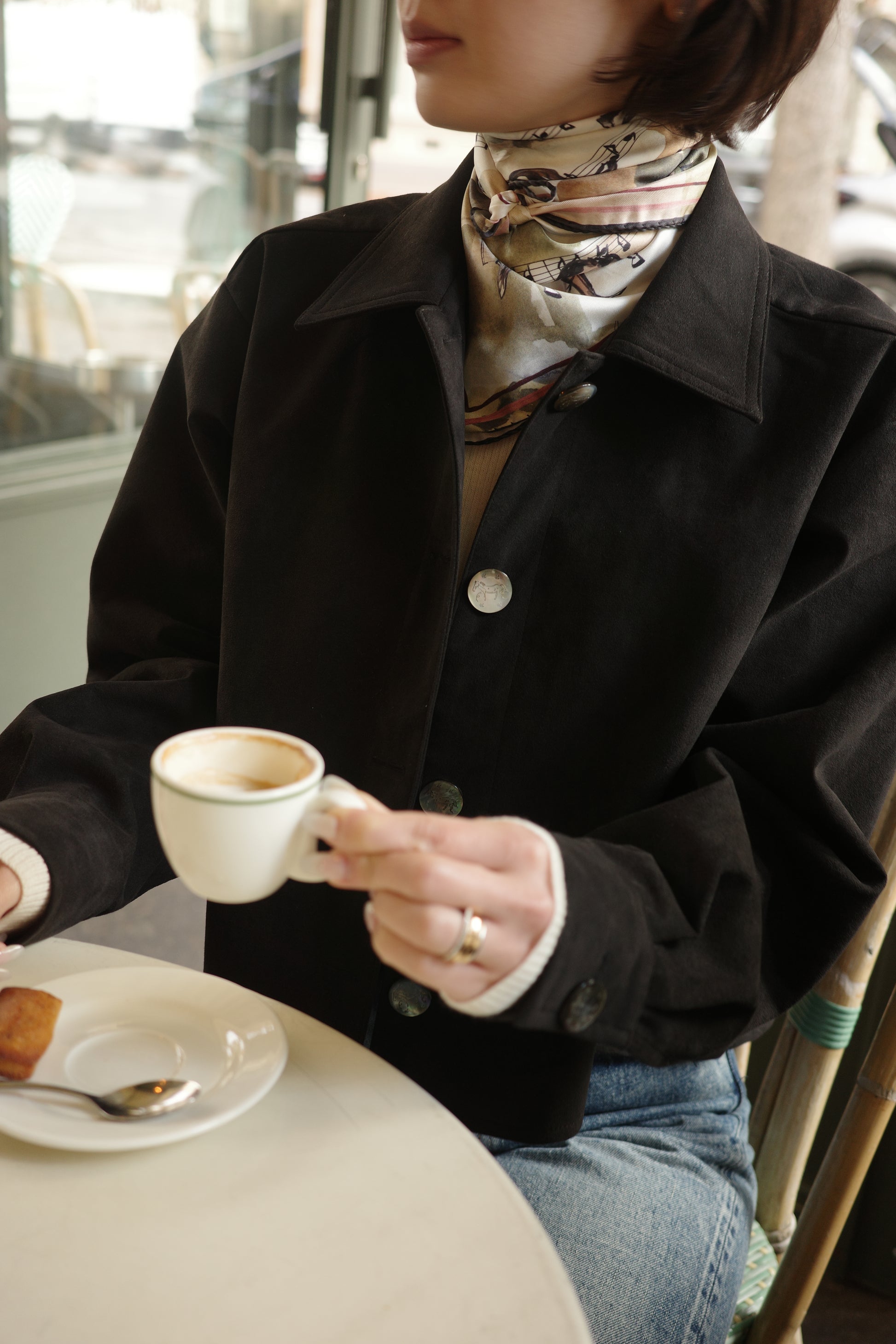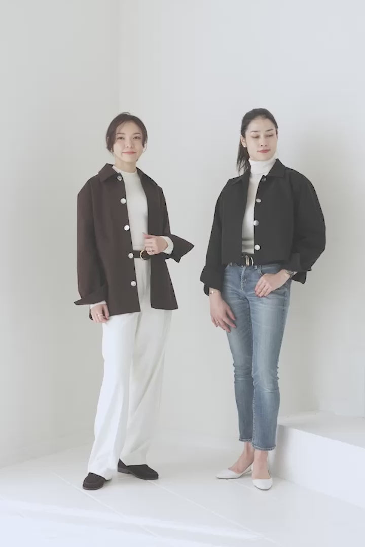 ◼︎デザイン:コンパクトな丈感と、バランスの良いAラインシルエット。イタリアのアーティストが描いた馬の図案をエングレービングした黒蝶貝ボタン(6個)がアクセントです。ややドロップした肩と程よいボリューム袖。上品さとカジュアルさを両立しました。