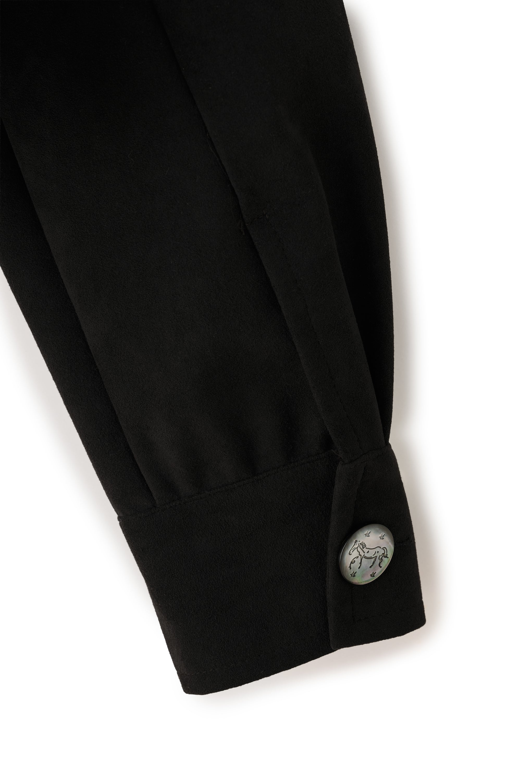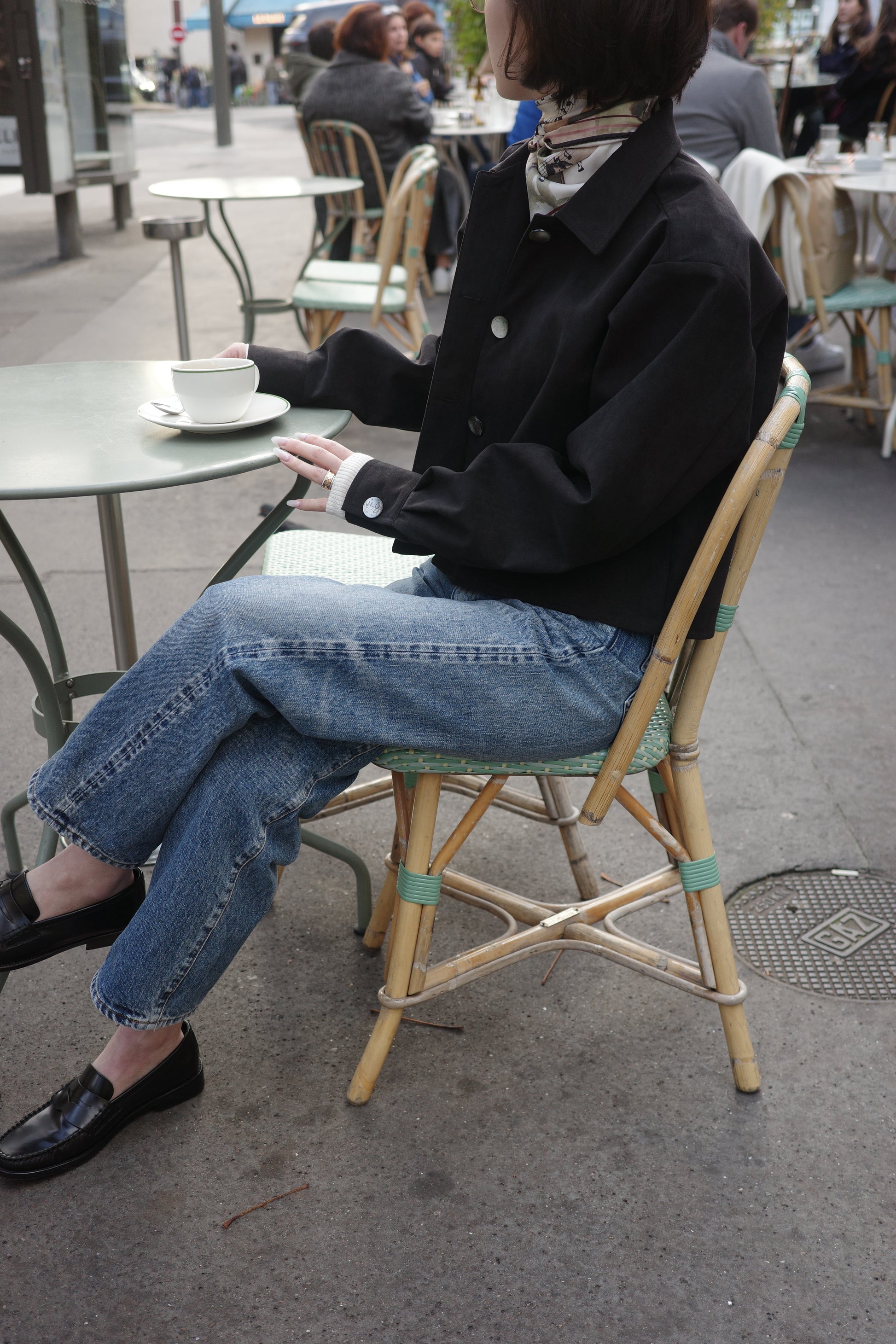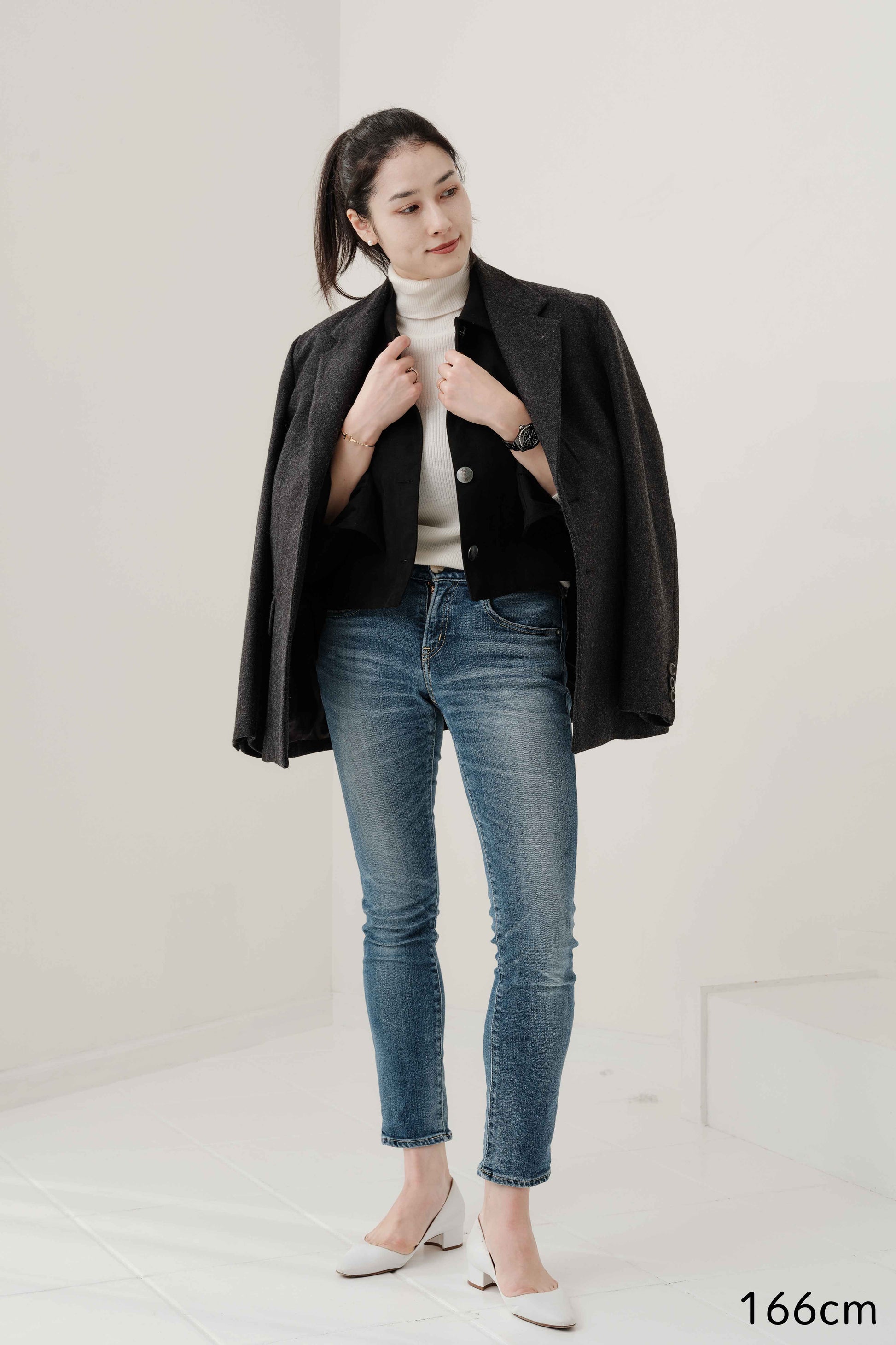 ◼︎デザイン:コンパクトな丈感と、バランスの良いAラインシルエット。イタリアのアーティストが描いた馬の図案をエングレービングした黒蝶貝ボタン(6個)がアクセントです。ややドロップした肩と程よいボリューム袖。上品さとカジュアルさを両立しました。